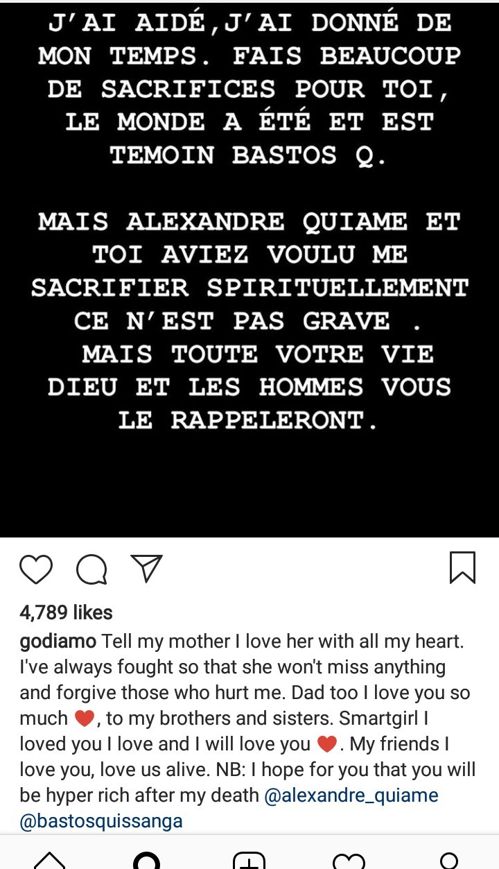 In his suicide note to his mom, Diamo wrote: "Tell my mother that I love her with all my heart.I have always fought so that she lacks nothing and forgives those who hurt me.papa also I love you so much ♥ ï¸�, to my brothers and sisters. Smartgirl I loved you I love you and I will love you ♥ ï¸�. My friends, I love you, let us love you alive. NB: I hope for you that you will be very rich after my death."