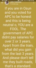 He said, “If you are in Osun and you voted for APC to be honest and this is being neutral o, YOU are a FOOL.